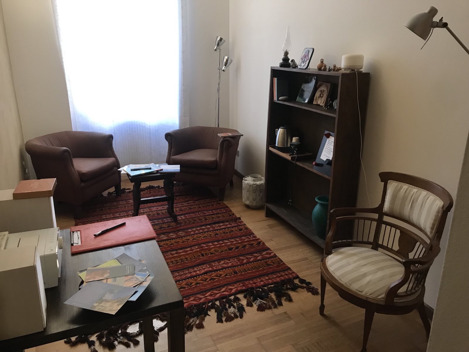 Lo studio è pensato come un luogo caldo e accogliente, uno spazio in cui innanzitutto sentirsi bene. È composto di due stanze, una in cui si svolgono i colloqui e l’altra come sala d’aspetto ma anche stanza in cui sostare un po’ dopo il colloquio (chi può e chi lo desidera) per raccogliere le idee, le sensazioni. È una stanza di raccoglimento interiore, ci sono a disposizione fogli e penne qualora uno volesse appuntarsi qualche pensiero, c’è la possibilità di farsi una tisana o un tè qualora uno volesse prendersi un momento di pausa, prima o dopo il colloquio.